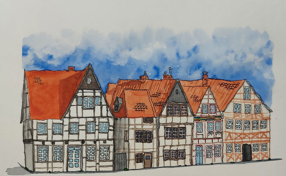 Beim Urban Sketching sollen Linien (in dem Fall wasserfeste Tinte) ja auch gar nicht perfekt sein und realistisch ist ohnehin nichts, was eine feste Rahmenlinie hat. Das nimmt Anspruch aus der Sache und erleichtert den Einstieg. Geschätzt habe ich aber erst 30 bis 40 Stunden in das Thema gesteckt, und das verteilt über die letzten 9 Monate - da ist meine Erwartungshaltung nicht allzu hoch. Das Bild im Querformat ist mal ein Beispiel für das Urban Sketching, in dem Fall eine reale Häuserfront anhand eines Fotos abgemalt. Habe aber ähnliches auch schon konstruiert.